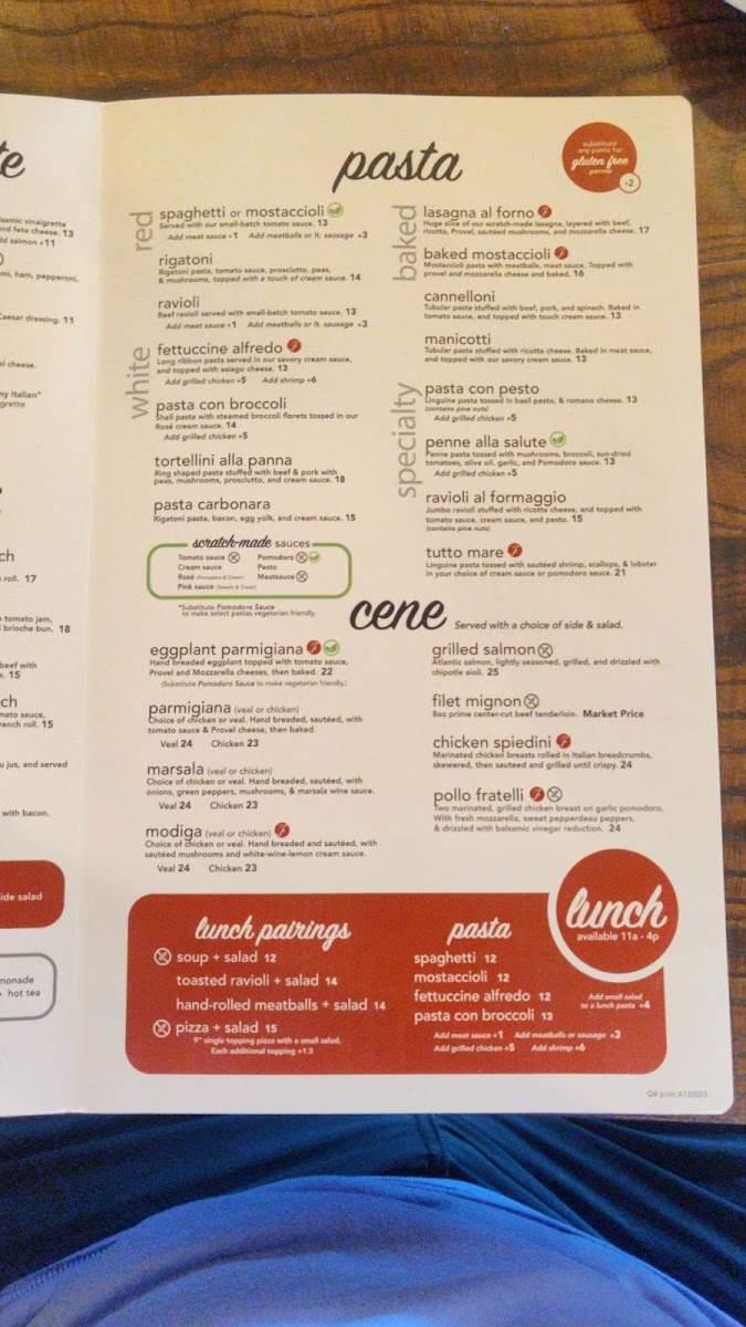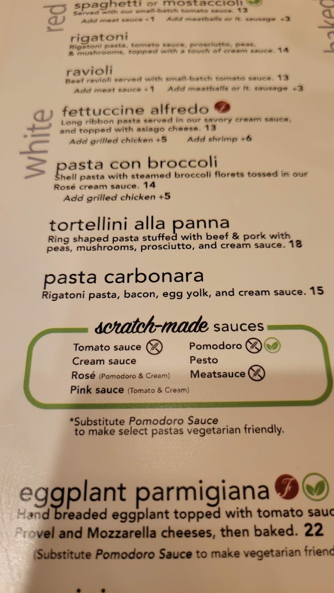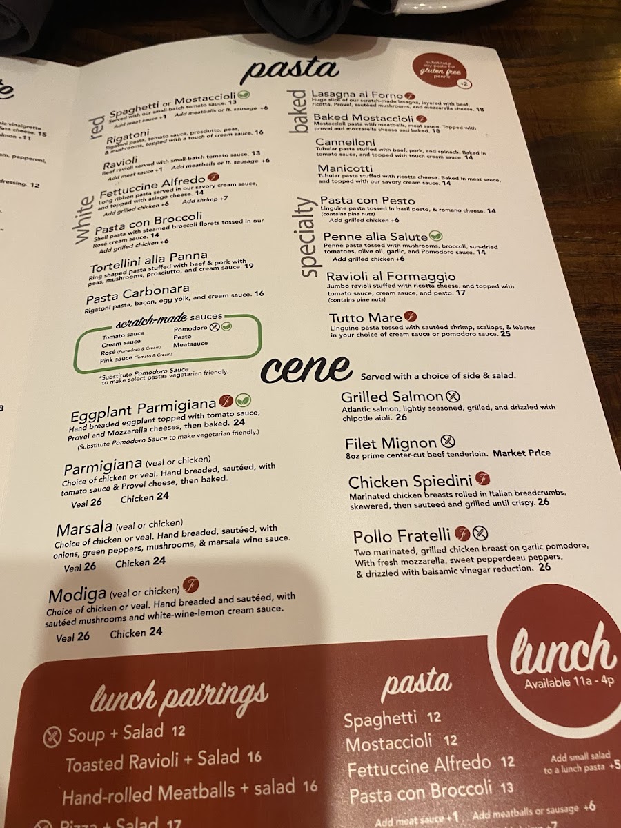 The menu offers a variety of traditional Italian dishes divided into several categories to accommodate different dining preferences. For pasta lovers, there are options like baked pasta dishes including Lasagna al Forno, Mostaccioli with meatballs, and Cannelloni stuffed with meats and spinach. A range of classic pasta preparations is also available, featuring items such as Fettuccine Alfredo, Rigatoni Carbonara, Tortellini Alla Panna, and Hand-Rolled Meatballs.